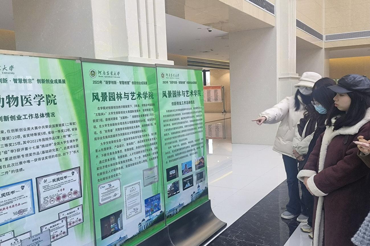 学生前往河南农业大学龙子湖校区英林大讲堂参观河南农业大学2023年“逐梦创新·智慧创意”创新创业教育主题成果展。