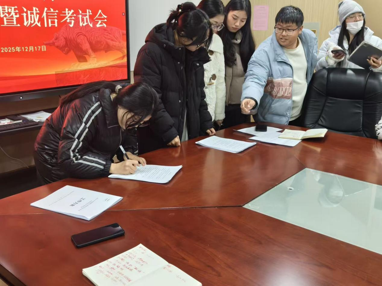 会上,老师结合当前考研形势,深入分析了近年来考研命题趋势与备考关键点,叮嘱学生们要精准把握最后冲刺阶段的复习节奏,注重知识点的梳理与整合,做到查漏补缺、精准发力。同时,鼓励学生们要以平和的心态应对考试压力,合理规划作息时间,保持良好的身心状态投入备考。老师表示,学院始终是同学们最坚实的后盾,将全力为考研学生提供必要的支持与保障,助力大家顺利应考。最后,为强化诚信意识,端正考风考纪,全体考研学生共同阅读并签署了《诚信考试承诺书》,将诚信考试的准则内化于心、外化于行。