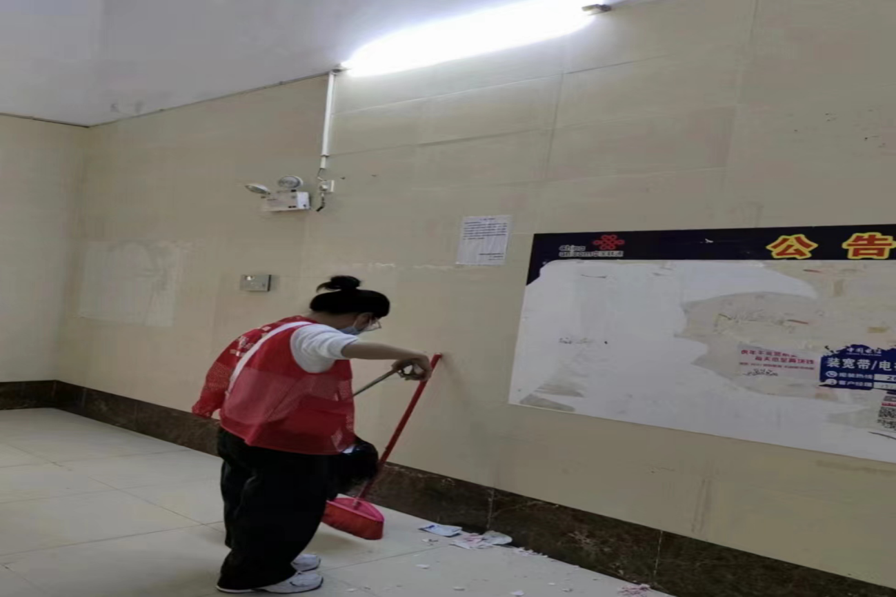 此次环境卫生整治活动,重点对小区楼道内公共区域乱堆乱放问题及卫生死角进行全面的整治清理。活动中,团队成员发扬不怕脏、不怕累的志愿服务精神,戴着手套,拿着小铲子、垃圾袋、喷壶等工具进行清洁整理。大家齐心协力,有序分工协作。一组志愿者负责对居民乱堆乱放的家具、杂物进行集中移走;二组志愿者则对小区单元楼内的小广告进行“地毯式”清理;三组志愿者负责清理社区内的垃圾、杂物等。同时在清理过程中志愿者们积极向居民宣传环境保护知识,呼吁大家抵制小广告,共同维护社区环境。