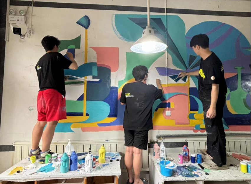 经过一天的辛勤努力,乡村艺绘队的成员基本完成了两幅墙面的绘制工作,这些墙面丰富了工作室室内环境的色彩构成,同时抽象的画法也为绞胎瓷的在色彩,形状,纹理等方面的创新提供了新的思路。在接下来的社会实践中,瓜子TV 墙绘队将为绞胎瓷的非遗文化传播与发扬做出贡献,为乡村振兴添“油”加“彩”。