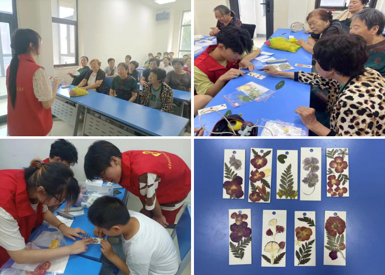 活动伊始,志愿者们将提前准备的压花材料给居民们一一介绍和展示,让居民们对此次活动进行初步了解。随后团队成员通过PPT展示了优秀的压花作品,详细生动地讲解了如何进行书本压花、压花的技巧以及压花的应用等。在压花制作环节,团队成员快速明确分组,手把手教居民们制作压花。为了让压花作品更加实用且具有纪念意义,志愿者们还教授了居民们如何利用压好的花材制作书签和扇子。居民们也纷纷配合,化身成为压花艺术家,发挥着自己的想象力与创造力,认真完成作品。作品完成后,大家都充满喜悦,积极地互动交流制作心得,分享着自己的作品,每一个作品都有其独特的风格,充满着别具一格的创意。