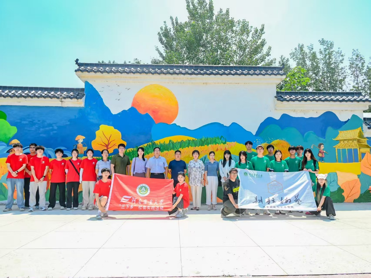 绘制过程中,团队成员分工明确,构图设计,调配颜料,勾线打底和刻画细节。尽管天气炎热,但同学们热情高涨,用画笔和色彩将原本斑驳老旧的墙面焕然一新。墙绘中融入了玉米、村民、丰收场景等乡土元素,还加入了现代艺术风格,使整体画面既接地气又不失时尚感,许多村民驻足观看。