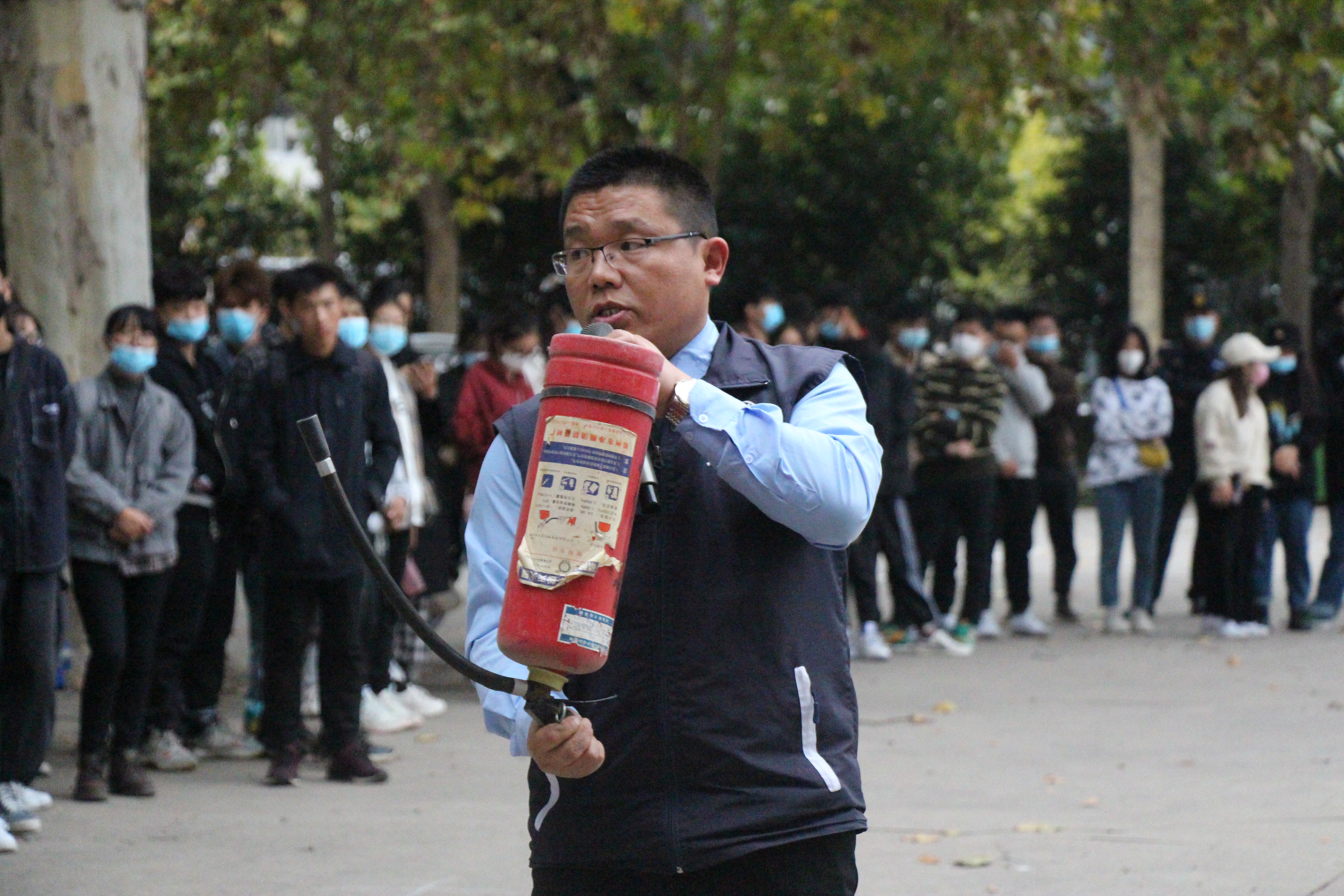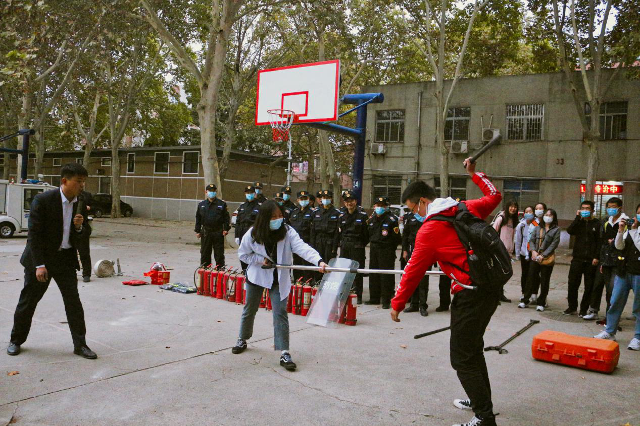 室外消防演练现场。曲志强教员给师生讲解和展示烟感报警器的工作原理,水基性灭火器、干粉灭火器、灭火毯、消防安全逃生锤等消防用品的使用方法,并组织师生进行模拟疏散演练和现场分批灭火操作演练。校保卫处老师向师生讲解和演练了喷雾剂、盾牌、警棍、防暴叉、防刺服等专用反恐防暴装备的使用方法、攻防技能和安全注意事项,并组织师生代表开展了盾牌警棍配合、防暴钢叉使用、单兵对抗、多人配合等校园反恐防暴突发性事件应急模拟训练和演练。演练现场组织有序、氛围热烈,师生参与热情高,纷纷评价现场学习效果好。
