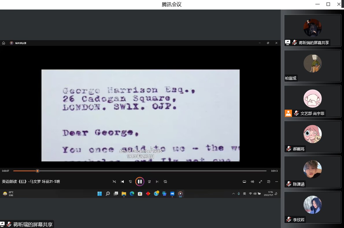 活动分为作品展示和评委打分两个环节。参赛选手们围绕“献礼二十大,青春就这Yang”的主题,结合自己的创意和构想,以歌唱表演、语言表演、手写信的方式向观众表达了对党和国家的热爱、对青春的精彩阐释。评委团依据作品主题、内容、感染力以及参赛选手的表现力等多方面进行打分,最终计算平均分,《The Show》、《白蛇传》、《写给未来的我的一封信》等30个作品顺利进入复赛。后期优秀作品将于学院新媒体公众号平台进行展示。