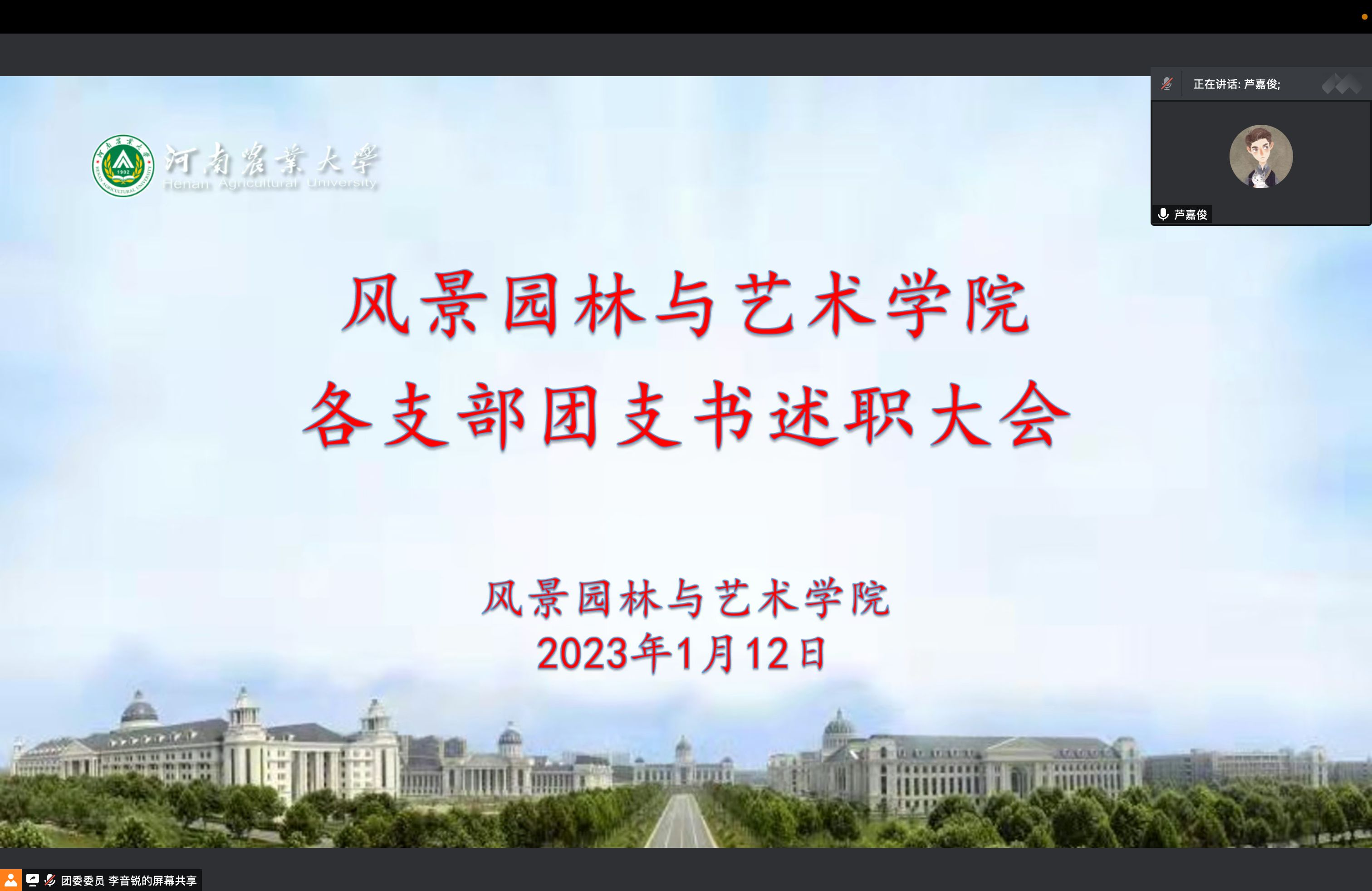于1月12日下午以线上会议的方式召开各支部团支书述职大会。院团委副书记李雨澍,团委老师史玥、马焱、芦嘉俊出席会议并对各班团支部进行评议,瓜子TV