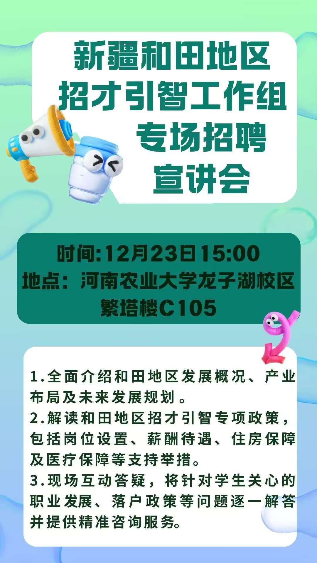 各位同学请注意,新疆和田地区招才引智工作组专场招聘宣讲会即将来袭,12月23日走进河南农业大学龙子湖校区!