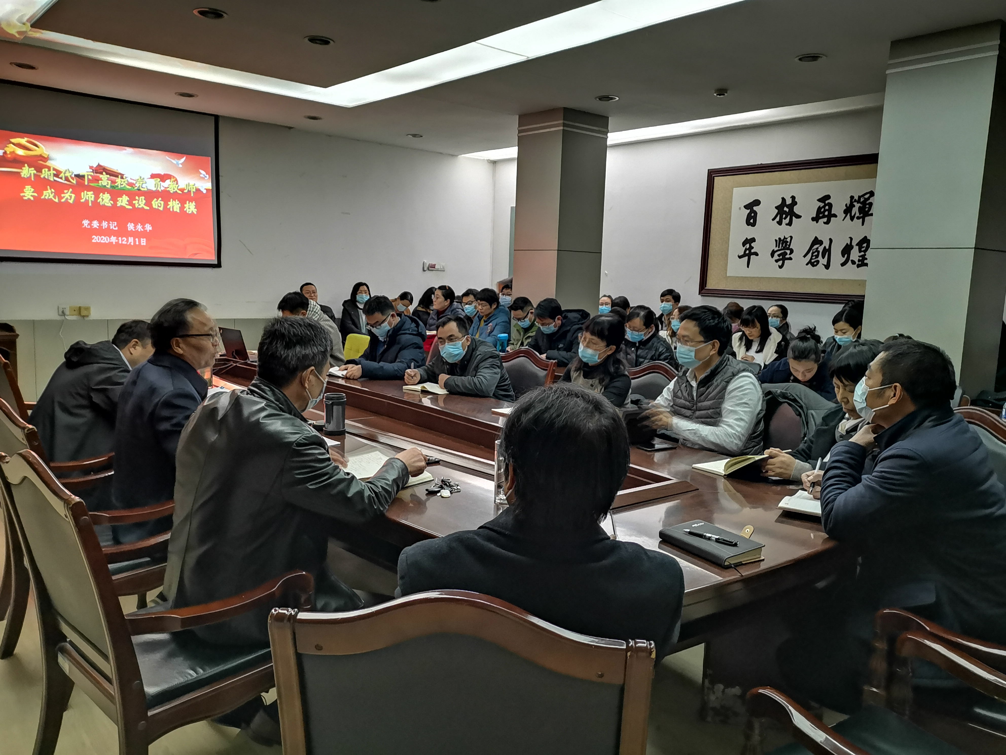 首先,侯永华从为什么要进行师德师风建设和怎么提高思想道德修养两方面出发,强调当代党员教师应充分认识到加强改进师德建设的紧迫性和重要性,将完善人、教育人、优化人渗透到教育教学的每一个环节。他表示广大党员教师应保持积极向上的进取心,坚定学习终身化理念,将党员意识内化于心、外化于行。最后,侯永华就如何发挥教师的价值导向作用对全体教工党员提出三点要求:一是要了解教师职业特点,明确教师角色的价值,对学生有温度、有感情,全心全意做好教育工作;二是要具有党员意识,思想上严格要求自己,提高自我要求的标准,牢记“十不得,十不准”;三是要与时俱进,认真钻研教学方法,更好地履行责任,积极为瓜子TV