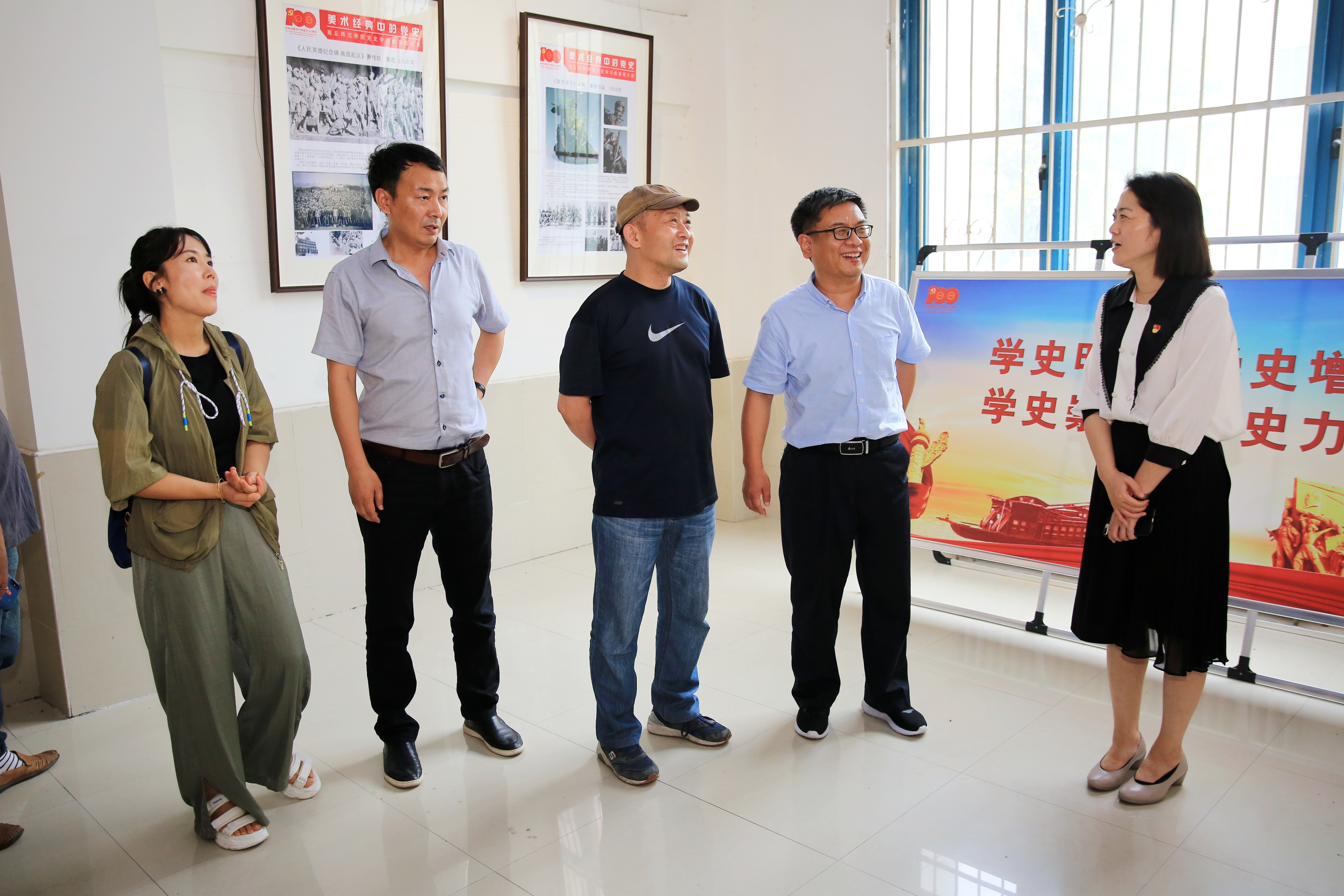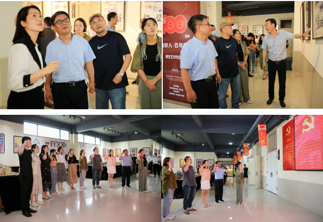 活动第二项:回望历史——商丘师范学院艺术设计学院党委书记杨莹莹、院长朱长征、副院长苏世昌、任然等陪同阴予兴一行在商丘美术馆参观学习了《党史学习教育图片展》,并在展厅外的党旗下,举行了重温入党誓词的党日活动。