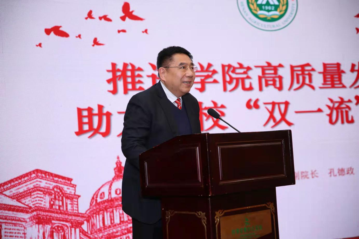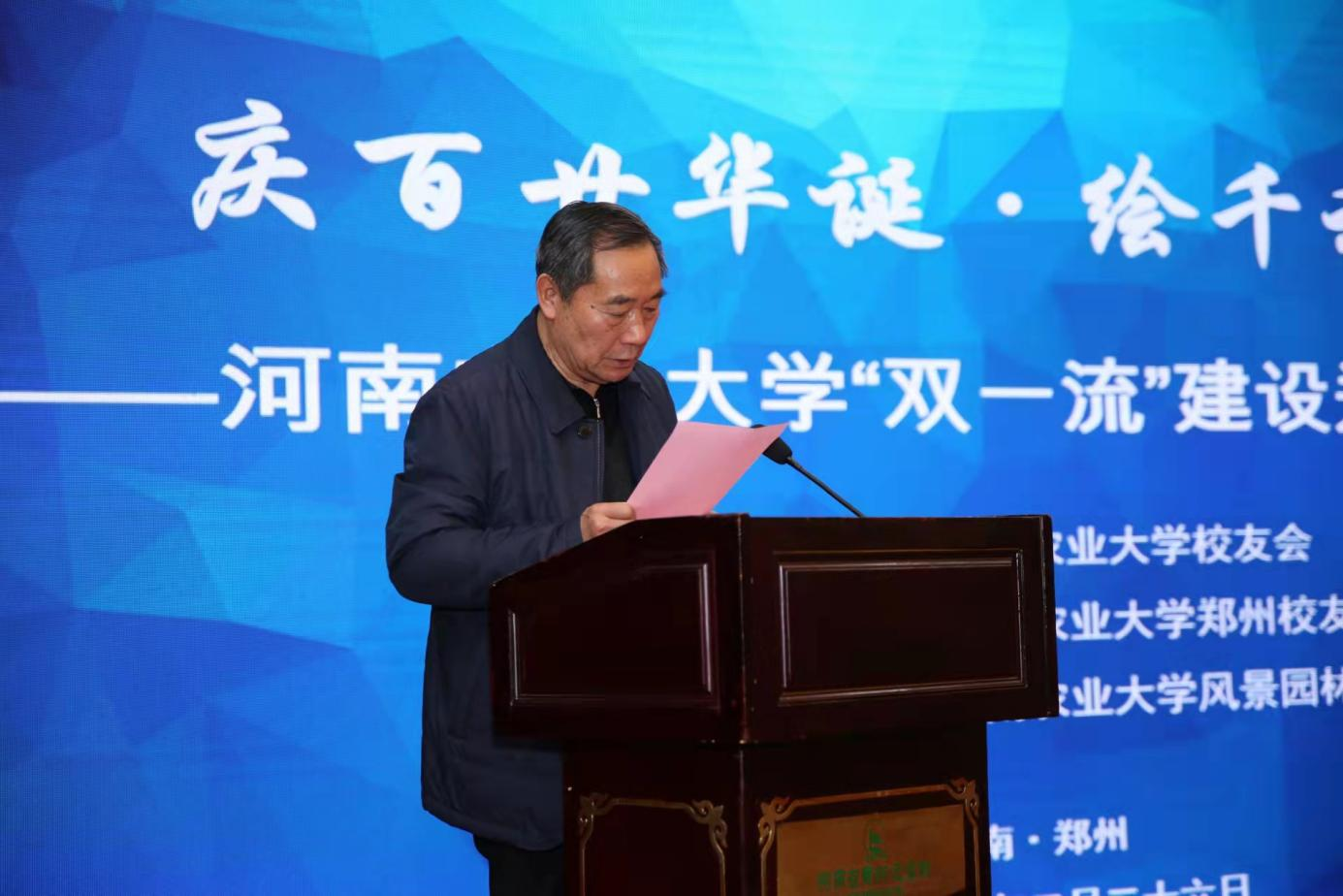 2月26日下午,由河南农业大学校友会主办,河南农业大学风景园林与艺术学院、河南农业大学校友会郑州联络处承办的“庆百廿华诞·绘千秋蓝图”——河南农业大学“双一流”建设郑州校友论坛在黄河迎宾馆隆重举行。河南农业大学党委书记魏蒙关、校长介晓磊、副校长康相涛,郑州市政府秘书长、市政府办公厅主任薛永卿,郑州旅游职业学院院长文广轩,中州大学原校长司福亭出席会议。党委办公室、校长办公室、校友办、校友总会负责人及风景园林与艺术学院领导班子成员、师生代表及校友代表共50余人参加大会。院党委书记侯永华主持论坛。