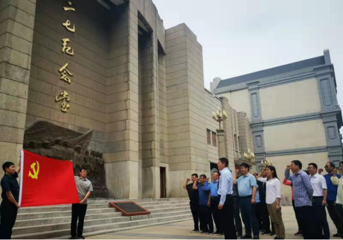 在二七纪念堂前,全体教工党员在党旗下庄严地举起右手,重温了入党誓词,激发了党员同志干事创业的热情和劲头,纷纷表示要秉承先烈的光荣传统和优秀品质,立足本职岗位,更加努力地做好各项工作。