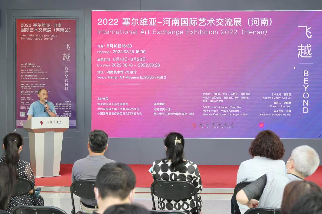 8月18日下午,“飞越·2022塞尔维亚-河南国际艺术交流展”在河南省美术馆正式开幕,瓜子TV 艺术系孟滨教授受邀参展并致辞。校党委副书记、工会主席李成吾,国际交流合作处处长屠克,学院领导及相关教师出席活动。