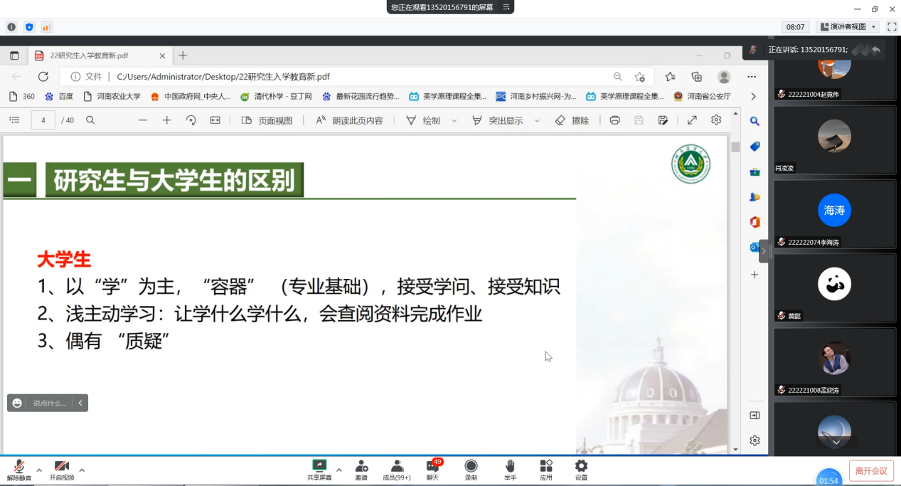 大会上,王献老师以《心态、信心、汗水、辉煌—做一名优秀的研究生》为主题做了入学专业教育。她首先介绍了研究生与大学生的区别,从“学而思”角度提出对研究生的新要求。同时她着重强调研究生要做好个人定位,从发现解决问题、信息搜集、开展研究、书写展示多方面入手提高个人能力素养,通过阅读汇报与交流快速熟悉研究领域。最后王献老师寄语全体研究生,要拥有责任感和使命感,以良好的心态、充足的信心、辛勤的汗水来共筑属于自己的辉煌。