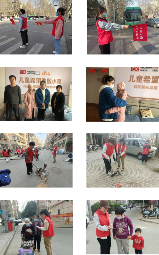 文化路上,志愿者同学们协助交管协警有序地引导着往来穿梭的机动车和行人,保障交通平稳有序。在农大社区里,同学们开展了社区环境治理活动,他们按照划分的区域对小区内道路、绿化带、宣传版面、健身器材进行清理,积极营造整洁优美、卫生干净的社区生活环境,同时还向老人儿童进行了安全知识普及。河南省儿童希望救助基金会助医小家中,我们的志愿者结合了自己的专业知识,向孩子介绍了绘画的要领,图文并茂地讲解了一些具体的技巧并带着孩子积极进行练习,过程中不仅让孩子收获了快乐,忘却了烦恼,让志愿者同学们更加意识到了助人为乐所能带给自己的快乐。母亲河岸边,一群身穿“红马甲”在绿色树丛中穿梭的志愿者同学们戴着手套,拎着黑色垃圾袋,在河滩边进行垃圾清理,用自己不怕吃苦不怕累的精神,为黄河的环境治理贡献着自己力量。