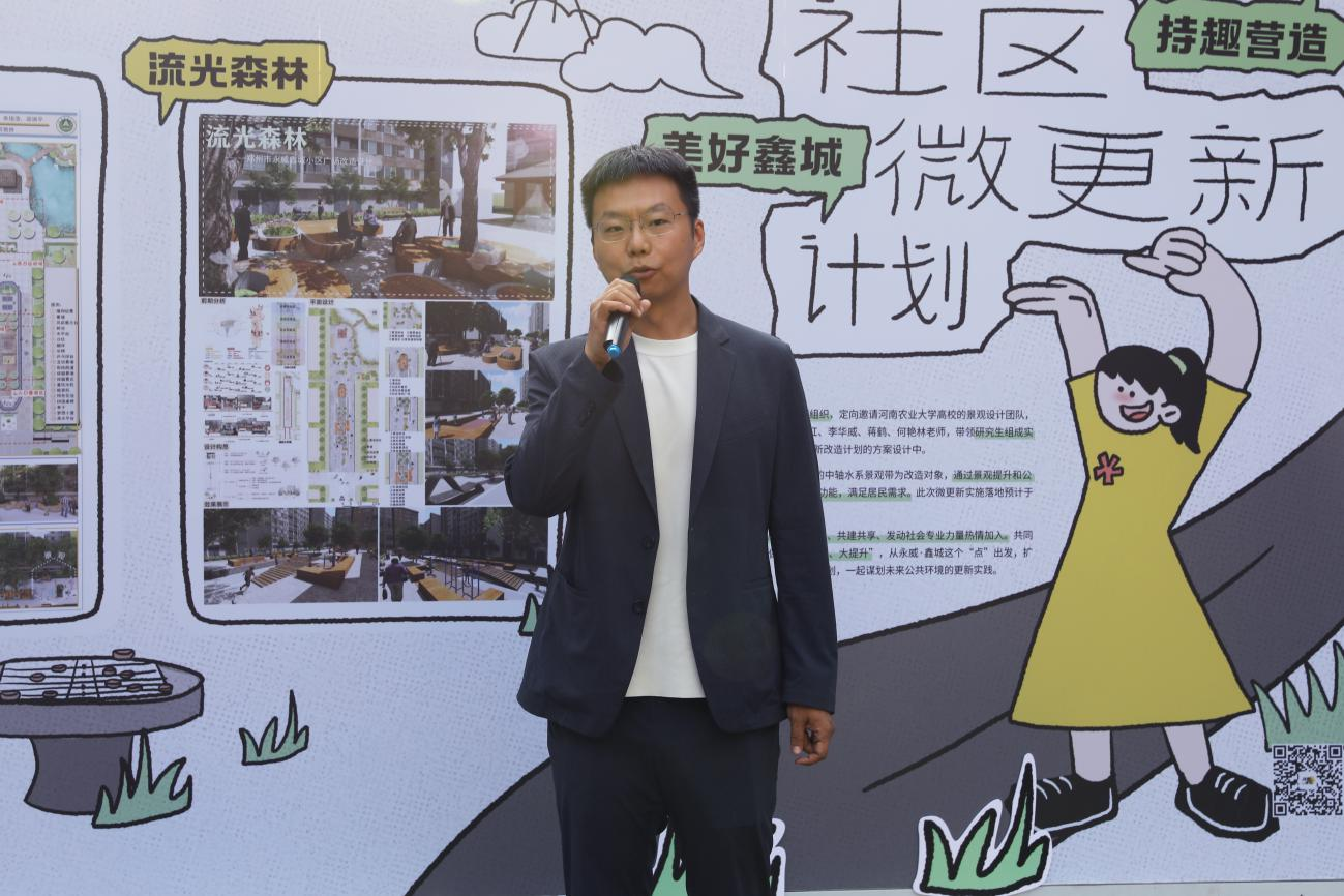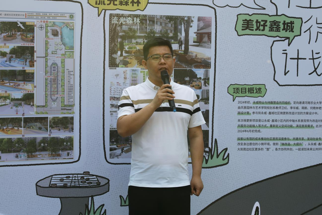 随后,王鹏辉提出了“三个感谢”,一是感谢河南农业大学景观设计团队对永威·鑫城社区的微更新、微计划、微提升改造;二是感谢持趣营造团队为社区及永威物业带来的惊喜,带领社区向更高、更强大、更远景的方面发展;三是感谢社区业主的大力支持,希望能共同迎接永威·鑫城社区崭新的历史时刻。