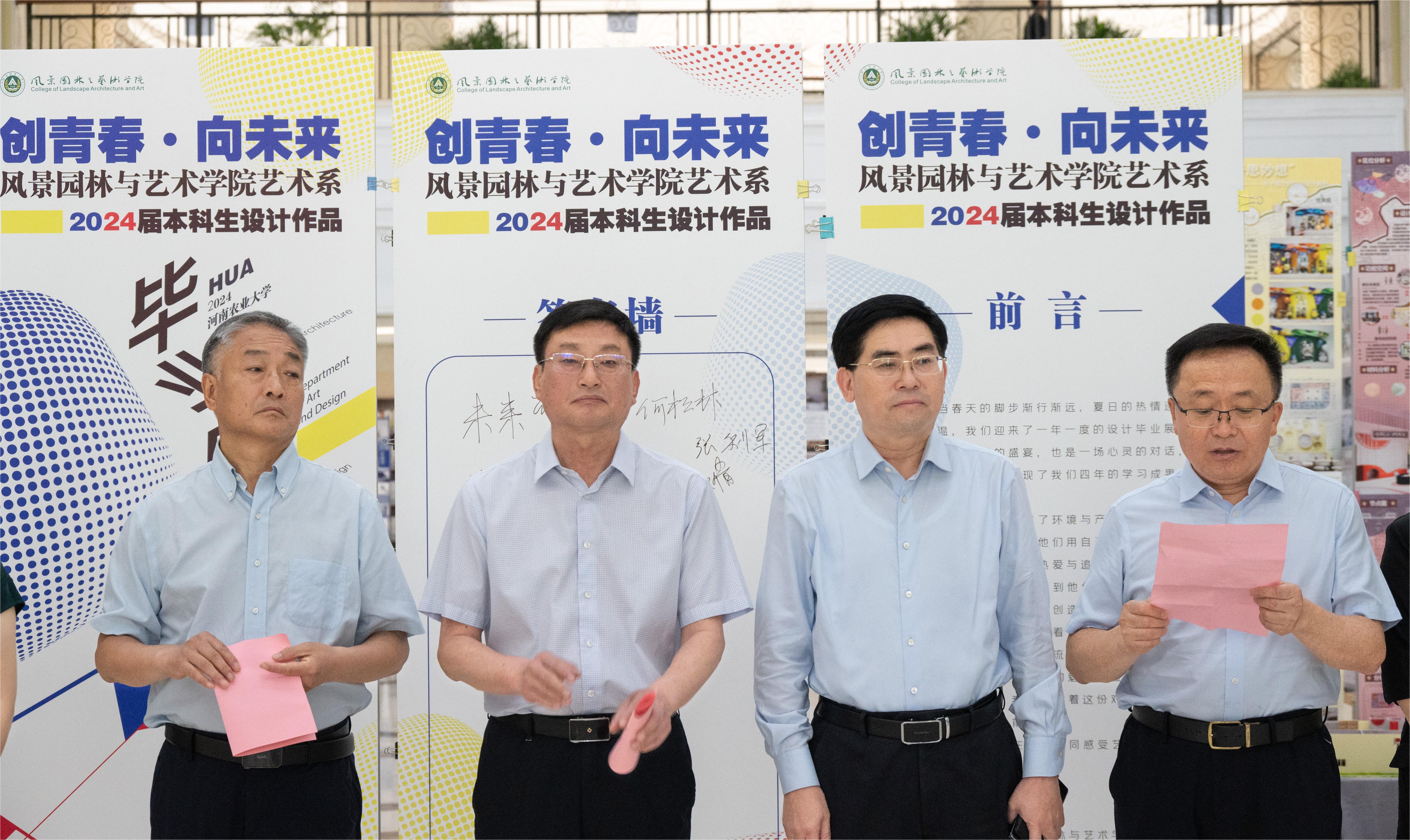 2024年5月23日上午,风景园林与艺术学院艺术系2024届本科生毕业生展在龙子湖校区图书馆一楼大厅开幕。校党委副书记何松林、副校长郭战伟出席开幕式。党委宣传部副部长陈玺、学生处副处长张利军、校团委副书记张倩、图书馆馆长张华,风景园林与艺术学院党委书记侯永华、院长田国行、副院长阴予兴、艺术系主任孟滨和艺术系全体教师及2024届毕业生参加。开幕式由侯永华主持。