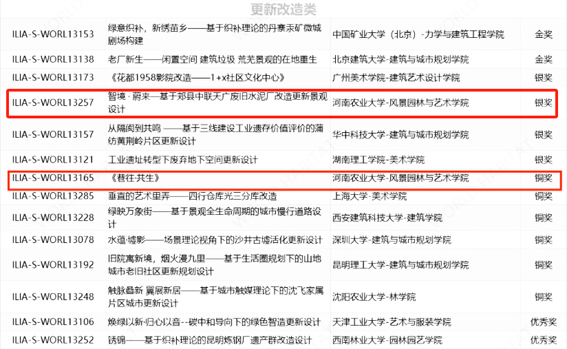 教师唐洁芳与学生易虹、李苏颖、陈文莉的团队设计作品《智境・蔚来——基于郏县中联天广废旧水泥厂改造更新景观设计》,获更新改造类银奖;教师冯艳与学生李扬、杜文超、刘雪莹、李胤哲、刘京雨的团队设计作品《巷往·共生》获更新改造类铜奖。