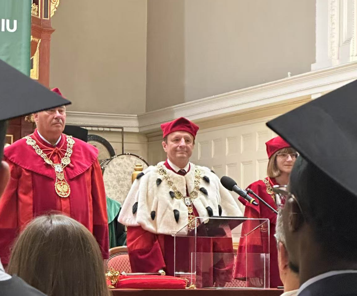 典礼伊始,波兹南生命科学大学(Poznań University of Life Sciences)校长 Prof. Dr hab. Krzysztof Szoszkiewicz 发表热情洋溢的致辞,并在讲话中充分肯定了联合培养硕士生们在学术研究和实践探索中取得的优异成绩。他指出,乡村振兴不仅是国家发展的战略重点,更是全球可持续发展的关键议题。毕业生们应秉持“终身学习、服务社会”的理念,勇于迎接未来挑战,积极投身乡村振兴实践,以所学知识助力区域经济与社会高质量发展。