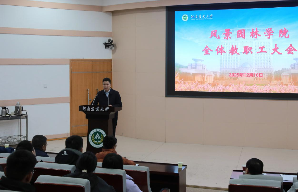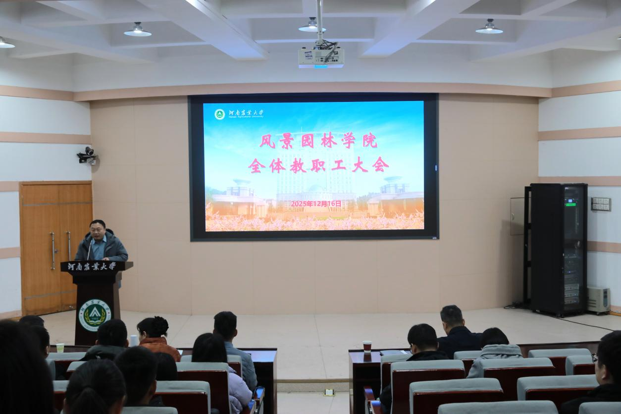 院党委书记胡明忠总结讲话。他首先感谢学校党委信任与全院师生接纳,回顾学院从园林教研室到独立学院的百年奋斗历程,向为学院发展倾注心血的历代前辈致以敬意。他表示,作为学院主要负责人,将与班子成员精诚团结,密切配合,全力推动学院事业高质量发展。结合工作思考,他提出五点要求。一是要坚持党建引领,筑牢发展根基。完善党委领导下的院长负责制,推动党建与中心工作深度融合。二是要聚焦立德树人,提升培养质量。破解专业吸引力难题,深化教学改革与师德师风建设。三是要强化学科特色,推动创新发展。瞄准学科前沿和国家战略需求,立足中原地域优势,促进学科交叉融合,力争重大项目与高水平成果突破。四是要深化内部治理,凝聚奋进力量。大力弘扬优良院风学风,营造团结干事的良好氛围。五是要坚守清正廉洁,永葆政治本色。严格落实党风廉政责任制,维护风清气正育人环境。最后,他号召全体教职工,要心往一处想、劲往一处使,同心同力、锐意进取,共同书写瓜子TV 更加美好的明天。